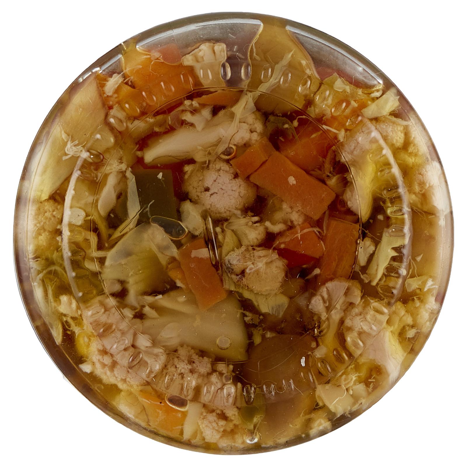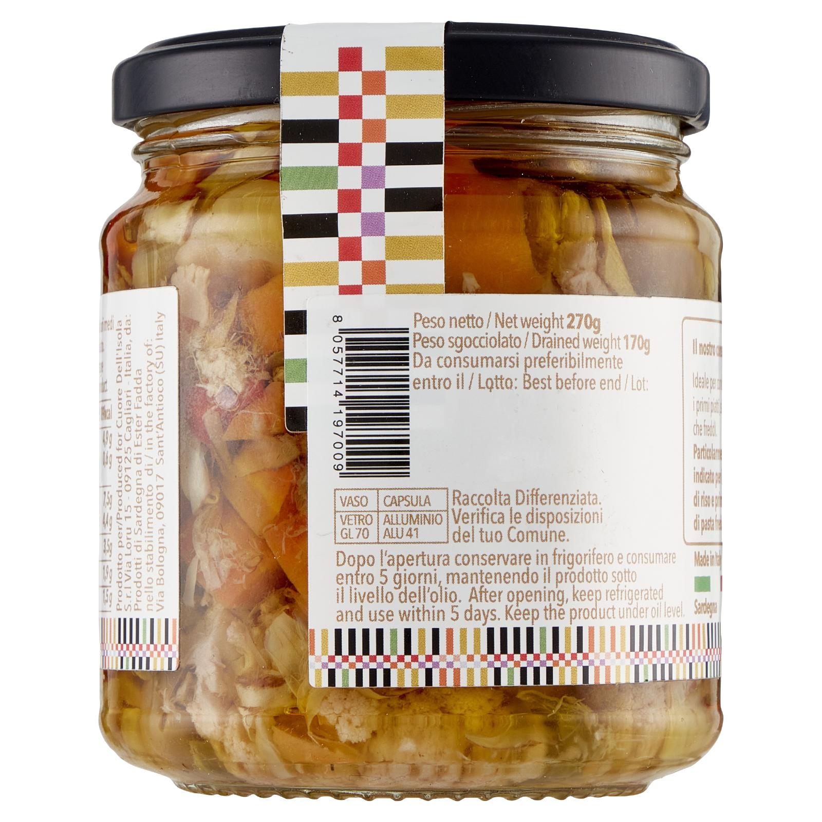 | Ingredienti | Carciofi, Sale, Olio di oliva, Olio di semi di girasole, Peperoni (in proporzione variabile) 62,96%, Olive, Cavolfiore, Carote, Funghi, Aceto (solfiti) |