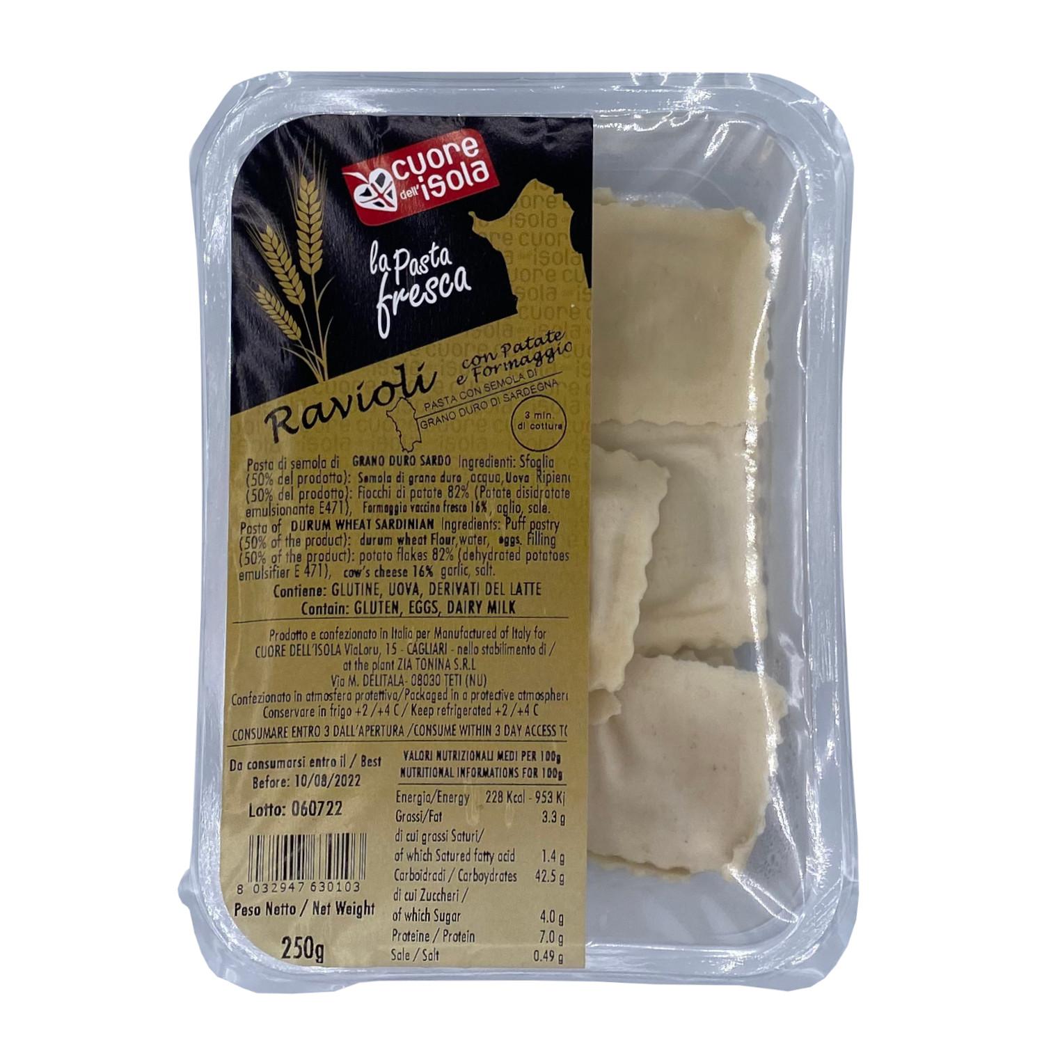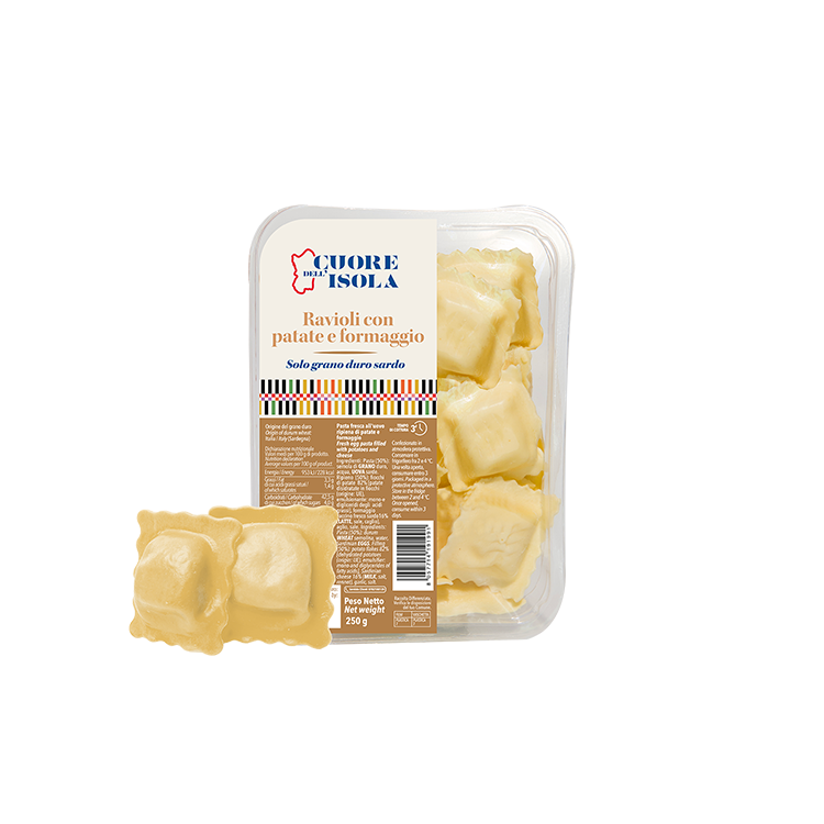 SFOGLIA (45% DEL PRODOTTO): SEMOLA DI GRANO DURO, ACQUA, UOVA; RIPIENO (55% DEL PRODOTTO): FIOCCHI DI PATATE 85% (PATATE DISIDRATATE, EMULSIONANTE E471, STABILIZZANTE E450, ANTIOSSIDANTI E 304-E 322, SPEZIE, ESTRATTI VEGETALI), FORMAGGIO VACCINO FRESCO 10%, AGLIO, SALE.Allergeni