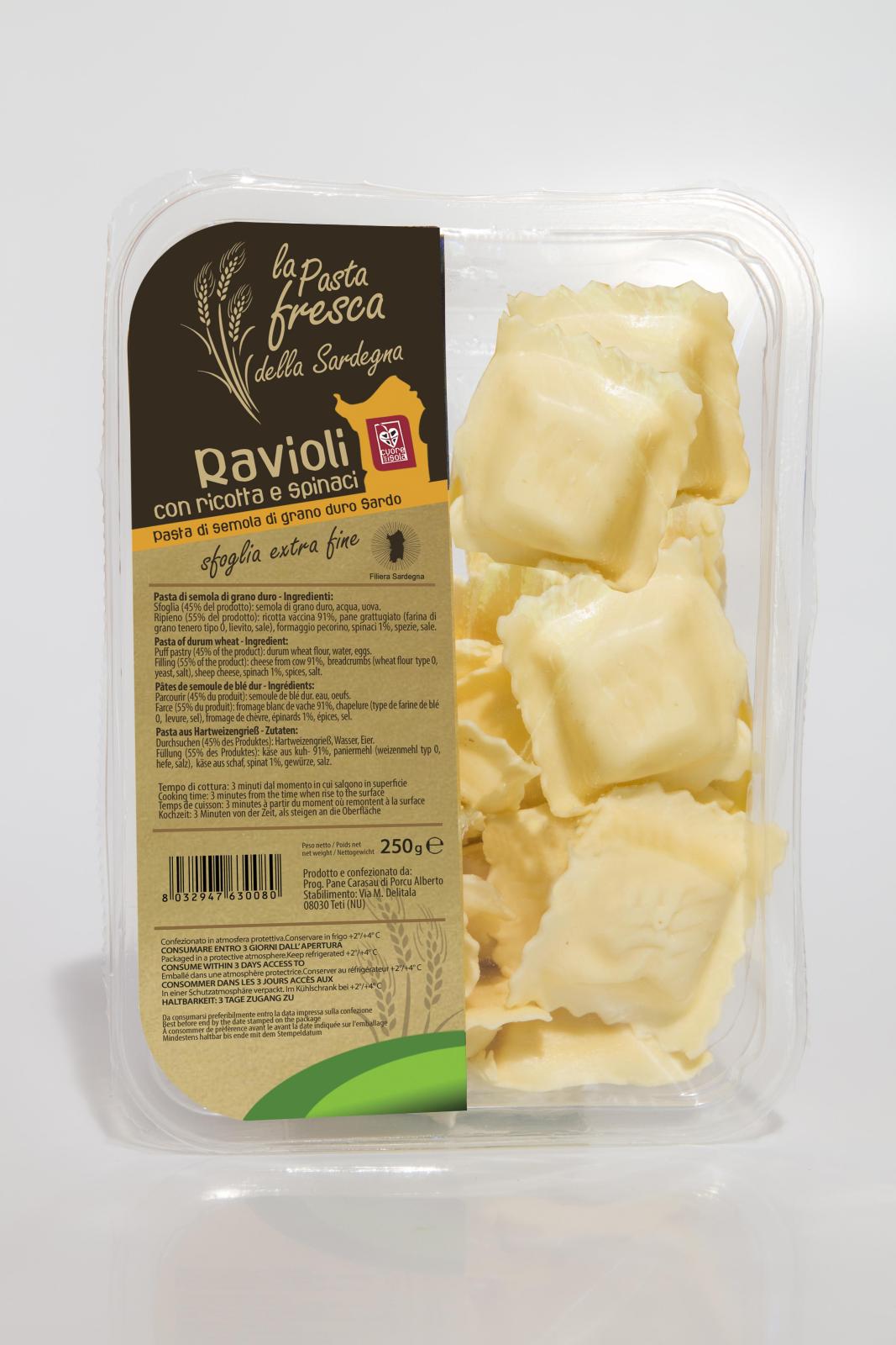 Sfoglia sottile di pasta fresca all'uovo prodotta con solo grano duro sardo, ripiena di ricotta e spinaci. Da preparare con gustosi sughi al pomodoro.