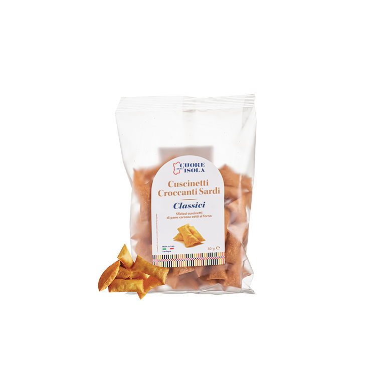 Home Tutti i prodotti Sfiziosi salati Cuore dell’Isola Cuscinetti Croccanti Sardi Classici 80 g